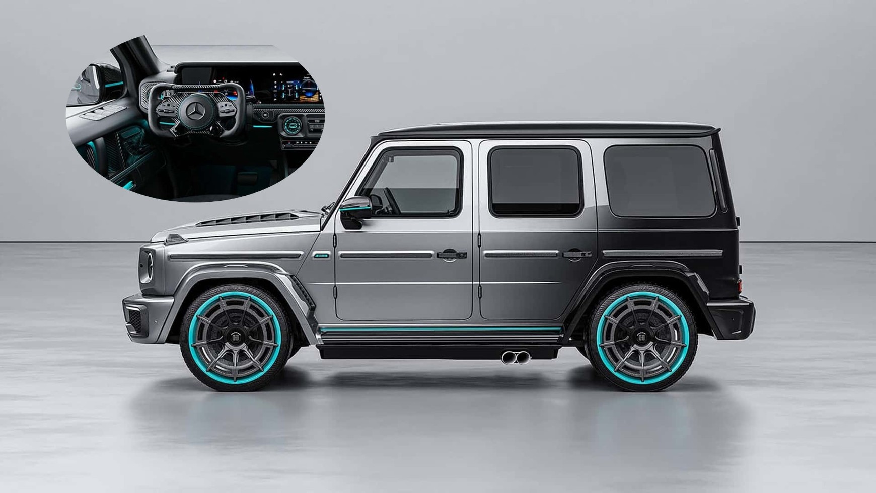 Tak bojowo prezentuje się Klasa G o mocy ponad 1000 KM. Charakterystyczny kolor akcentów na nadwoziu nawiązuje oczywiście do bolidów Mercedesa. To barwa głównego sponsora firmy Petronas, która w ciekawy sposób kontrastowała z tradycyjnie srebrnym, a w niektórych sezonach czarnym malowaniem bolidu.