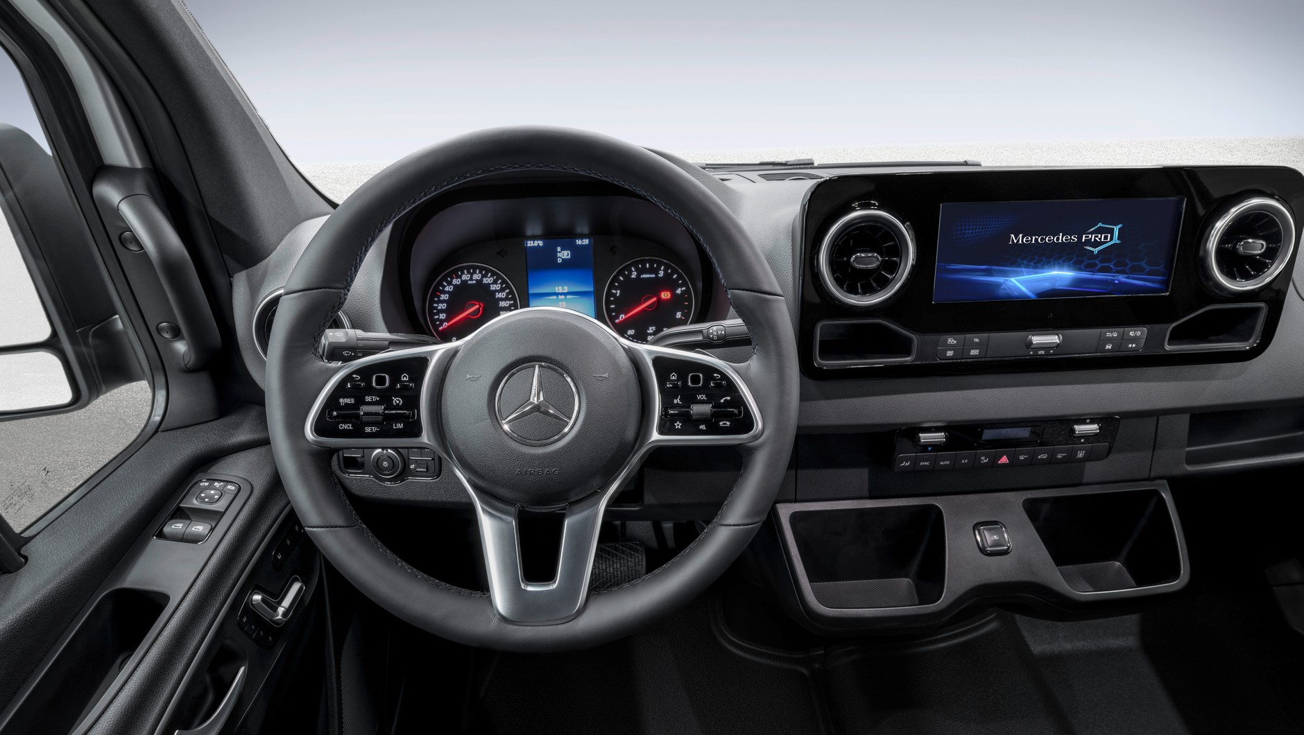 Telematyka to jednak nie wszystko. Równie ważne są warunki pracy kierowcy. A te ponoć mają być znacznie lepsze w porównaniu z poprzednią wersją. Mercedes chwali się, że w Sprinterze pojawią się rozwiązania znane m.in. samochodów osobowych. Wzorem Klasy A będzie kilka gniazd USB-C (do najnowszych telefonów), Android Auto, CarPlay, dotykowe elementy sterujące w kierownicy, przetwornica z gniazdkiem 230V, dodatkowe zamykane schowki. A to nie wszystko. By zwiększyć ilość miejsca w kabinie, zrezygnowano m.in. z tradycyjnej dźwigni hamulca ręcznego (będzie elektryczny). Przeprojektowano fotele, które wzbogacono w uchwyty na kubki (pod siedziskiem dla pasażerów) oraz wysuwane podparcie dla ud. Po raz pierwszy w Mercedesie pojawi się ekran dotykowy. Na drugim końcu skala będzie wersja pozbawiona nawet takich dodatków jak radio.