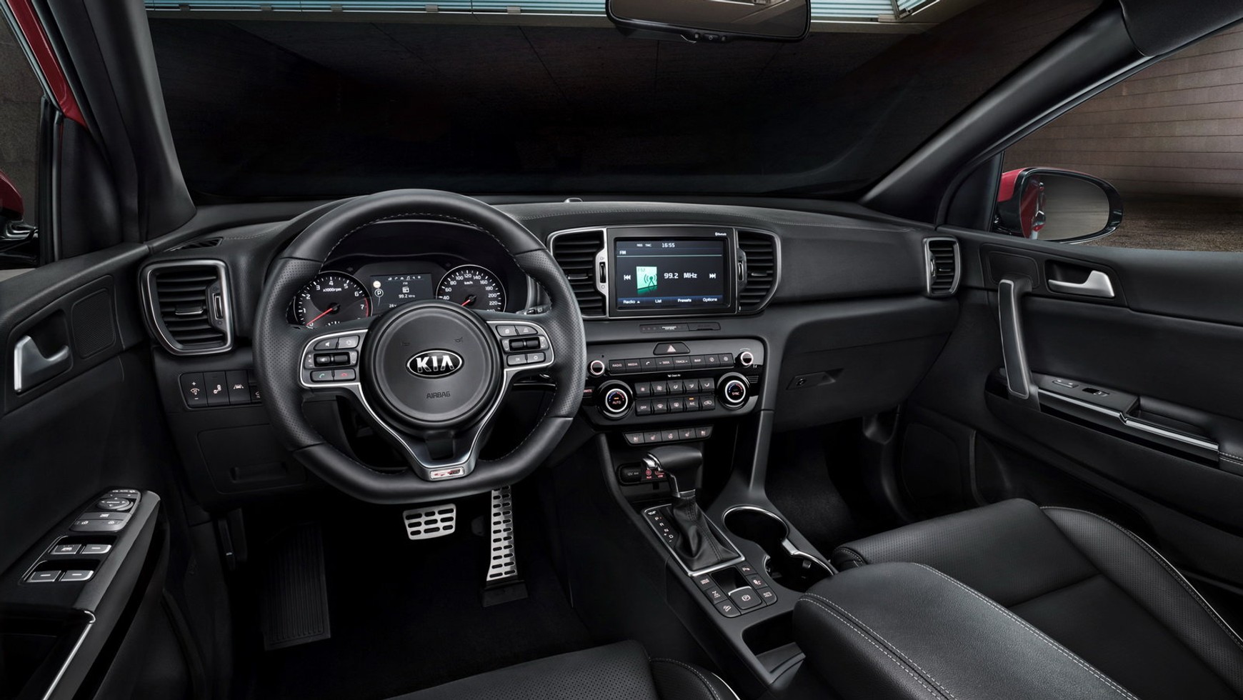 Jak widać na pierwszych zdjęciach wnętrza Kii Sportage deska rozdzielcza wygląda masywnie, jak w prawdziwie terenowym samochodzie, choć modelowi daleko do off-roadu. Projektanci podzielili ją na dwie części – górną „informacyjną” i dolna „sterującą”. Ta pierwsza składa się z wyświetlaczy – przed oczami kierowcy i opcjonalnym 7- lub 8-calowym ekranie HMI. Druga natomiast to ergonomicznie usytuowane przyciski i przełączniki.