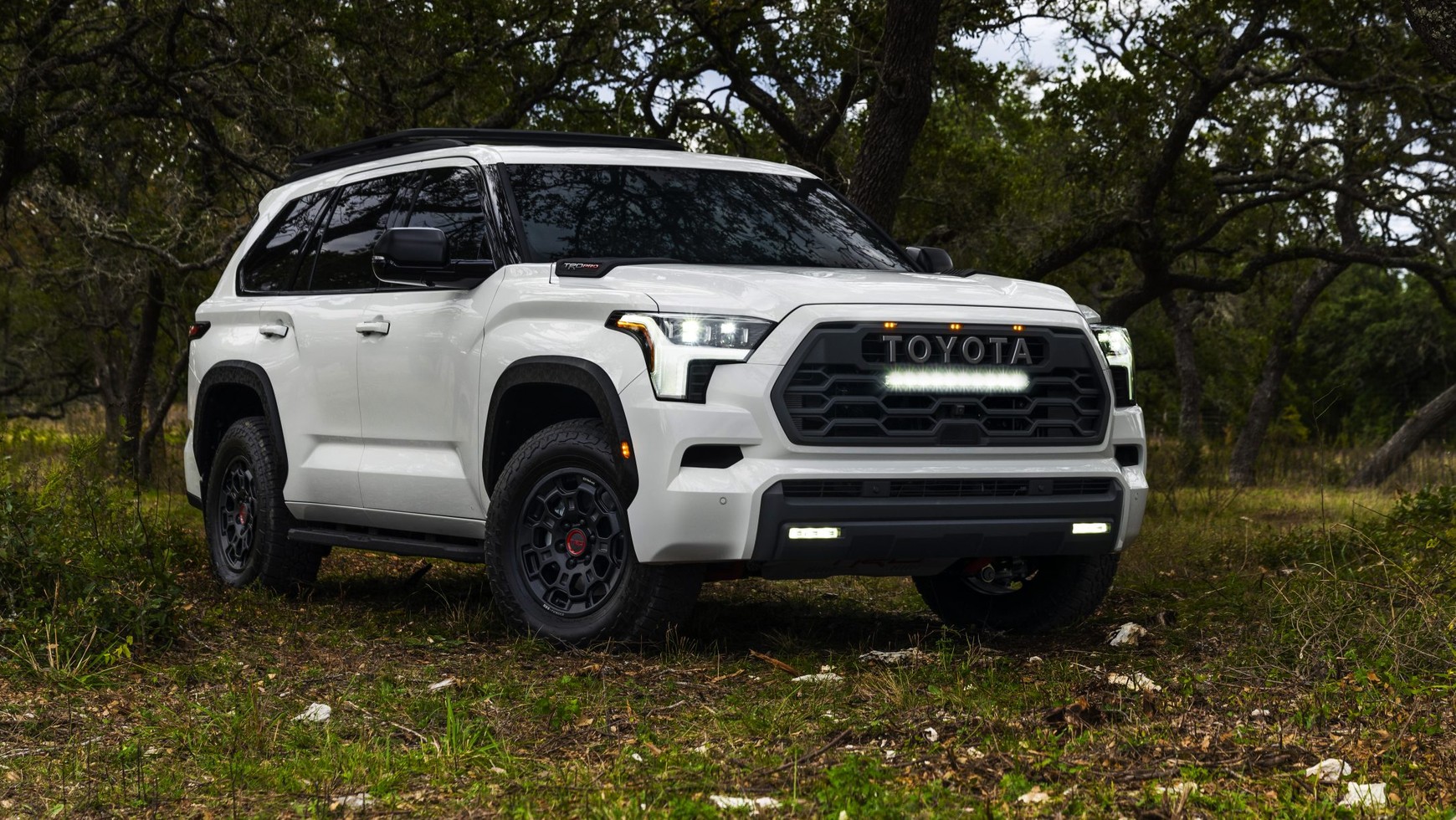 O ile mam wątpliwości czy Sequoia zbudowana na ramie może być rzeczywiście usportowiona, tak mam pewność, że terenowa wersja TRD Pro poradzi sobie w naprawdę trudnym terenie. Tu już jest konkret, bo samochód ma wewnętrzne amortyzatory FOX zestrojone przez TRD, płytę pod silnikiem, bagażnik dachowy, blokadę tylnego mechanizmu różnicowego i mniejsze, 18-calowe koła, na których znajdują się 33-calowe opony, na których można już próbować topić się w błocie. Wizualne zmiany, to szersze nadkola, inny grill z napisem "TOYOTA" i podwójna końcówka wydechu. W środku zaś są akcenty dedykowane temu rodzajowi wyposażenia na siedzeniach i gałce zmiany biegów, zmieniono kierownicę, a drugi rząd siedzeń ma fotele kapitańskie.