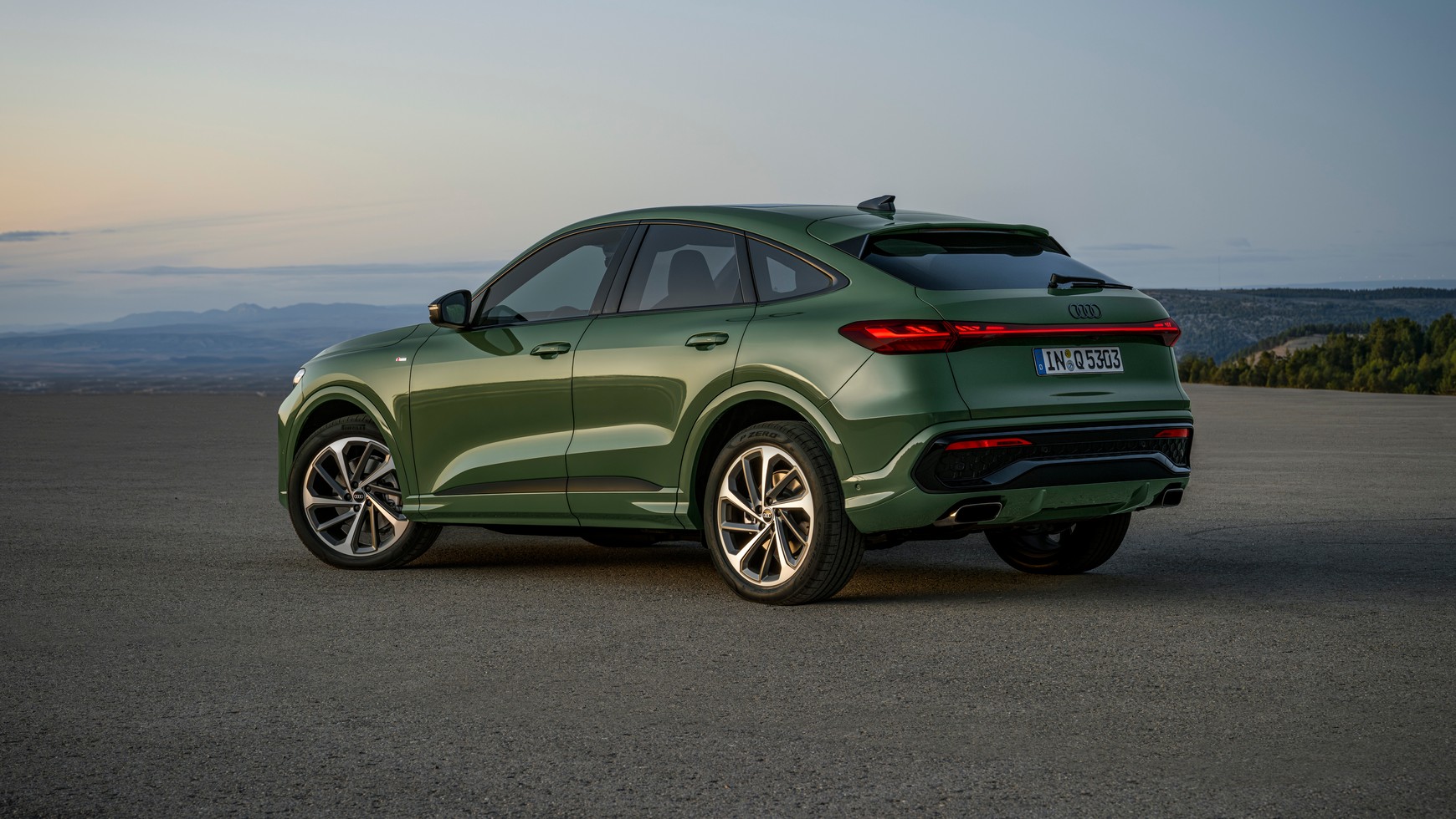 Patrząc z boku, dostrzeżemy linię wznoszącą się ku tyłowi — ta biegnie od nadproża przez nadkola aż do tylnego zderzaka. Pozioma linia, łącząca przednie i tylne światła, unosi się nieco powyżej tych ostatnich i wizualnie wspiera łuk dachu z płaską tylną szybą. W tylnej części nadwozia sportowy charakter Q5 Sportbacka podkreślają dyfuzor zintegrowany z podniesionym zderzakiem oraz rury wydechowe, które w przypadku wersji SQ5 Sportback mają podwójne okrągłe końcówki o nowym, zaostrzonym wyglądzie.