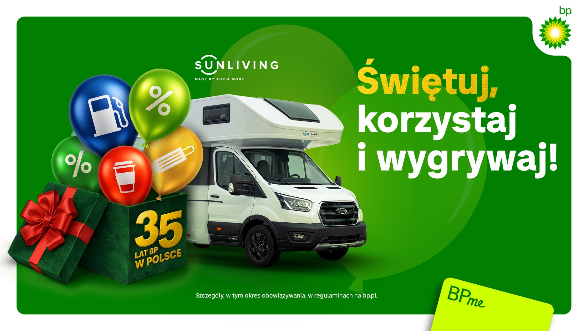 Wyjątkową atrakcją dla klientów bp jest konkurs przygotowany z myślą o wszystkich, którzy kochają podróżować. Nagrodą główną w konkursie jest nowoczesny, rodzinny kamper, nie tylko wartościowy pojazd, ale także symbol stylu życia i wolności podróżowania. Podróżowanie idealnie wpisuje się w hasło “Moja podróż zaczyna się na bp”– symbolizuje przygodę i wieloletnią relację marki bp z kierowcami. Oprócz nagrody głównej klienci bp będą mogli wygrać również liczne nagrody dodatkowe.