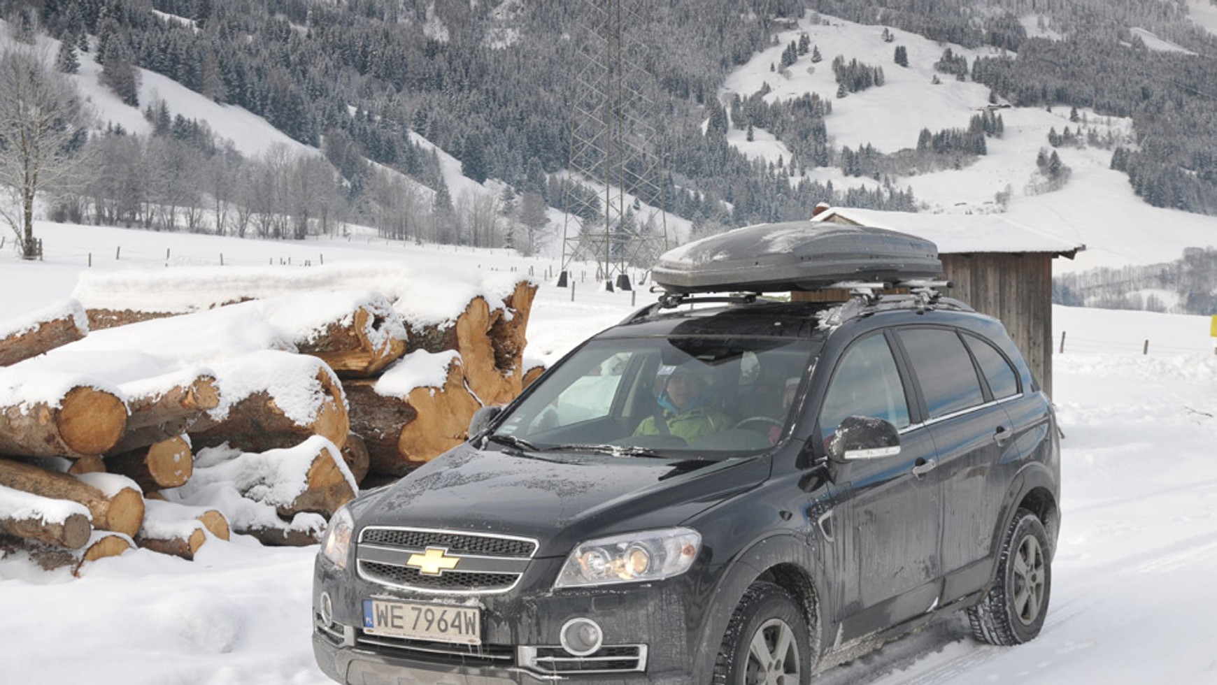 Ośnieżona droga to idealne miejsce na test napędu 4x4 Captivy. Bardzo niskie zużycie paliwa, nawet z boxem Thule Dynamic 800