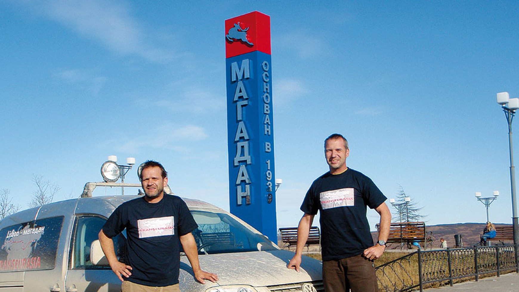 Do Magadanu Göttenauer i Renz docierają 11 października o 13.30 czasu lokalnego. Licząca ponad 15 tys. km Transeurasia jest najdłuższą na świecie trasą wiodącą przez jeden kontynent (licząc wspólnie Europę i Azję). Powie ktoś: no tak – pewnie mieli mnóstwo sprzętu i mocną terenówkę. Nic podobnego. Podróżnicy dokonali tego za kierownicą niemal seryjnego Volkswagena Caddy Maxi z napędem 4Motion (sprzęgło Haldex).