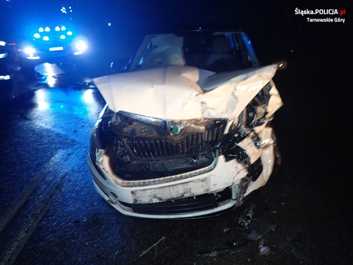 Zgłoszenie o wypadku wpłynęło do tarnogórskiej policji w piątek po godzinie 22:30. Na miejsce natychmiast skierowano funkcjonariuszy z wydziału ruchu drogowego. Wstępne ustalenia wskazują, że 19-letni kierowca kią ze Strzelec Opolskich, nie dostosowując prędkości do panujących warunków, zjechał na przeciwny pas ruchu, co doprowadziło do zderzenia z nadjeżdżającą skodą.