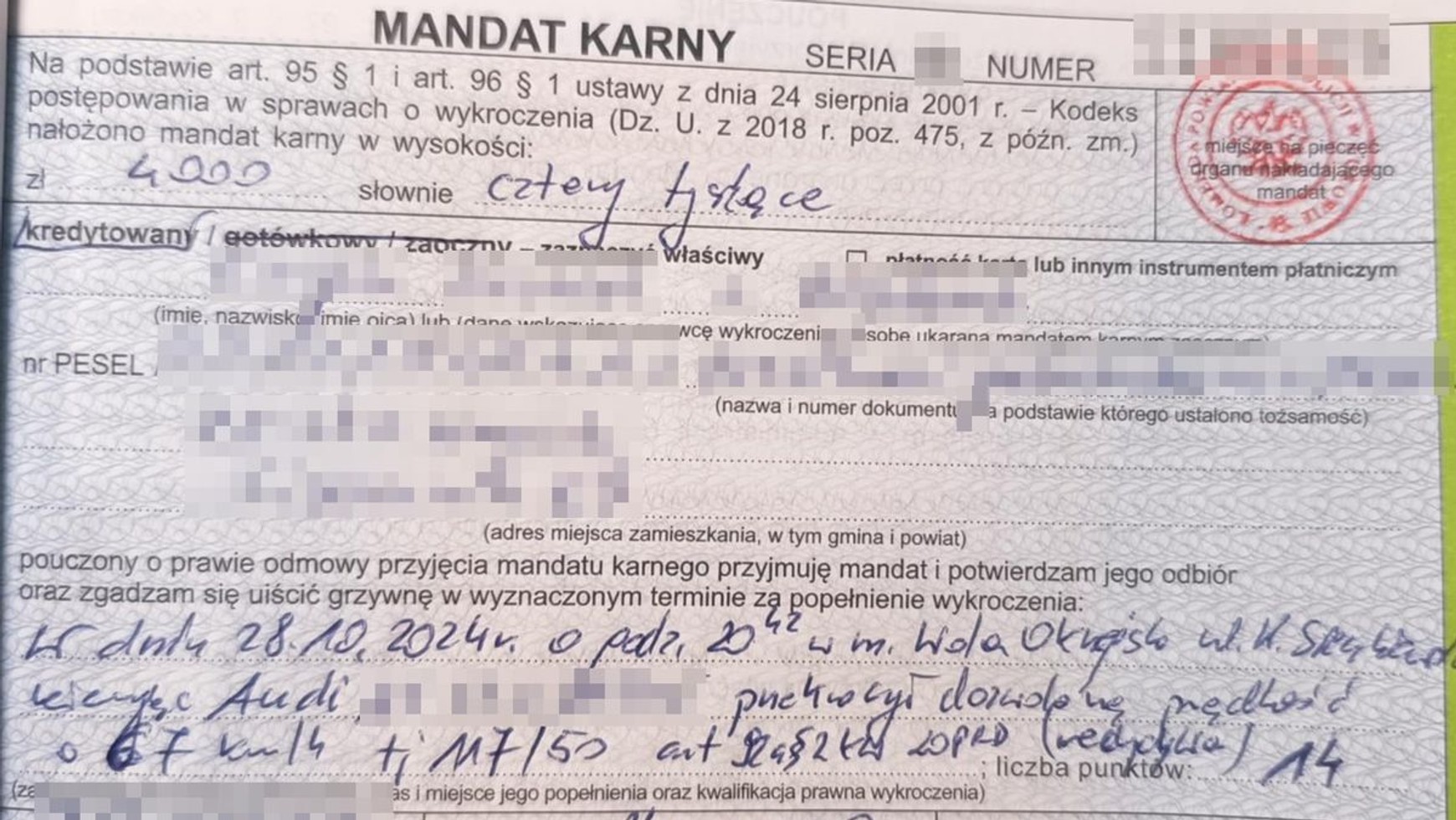 Oznaczało to podwójną wysokość mandatu, który wyniósł w tym przypadku aż 4000 zł. Na kierowcę policjanci nałożyli ponadto 14 punktów karnych.