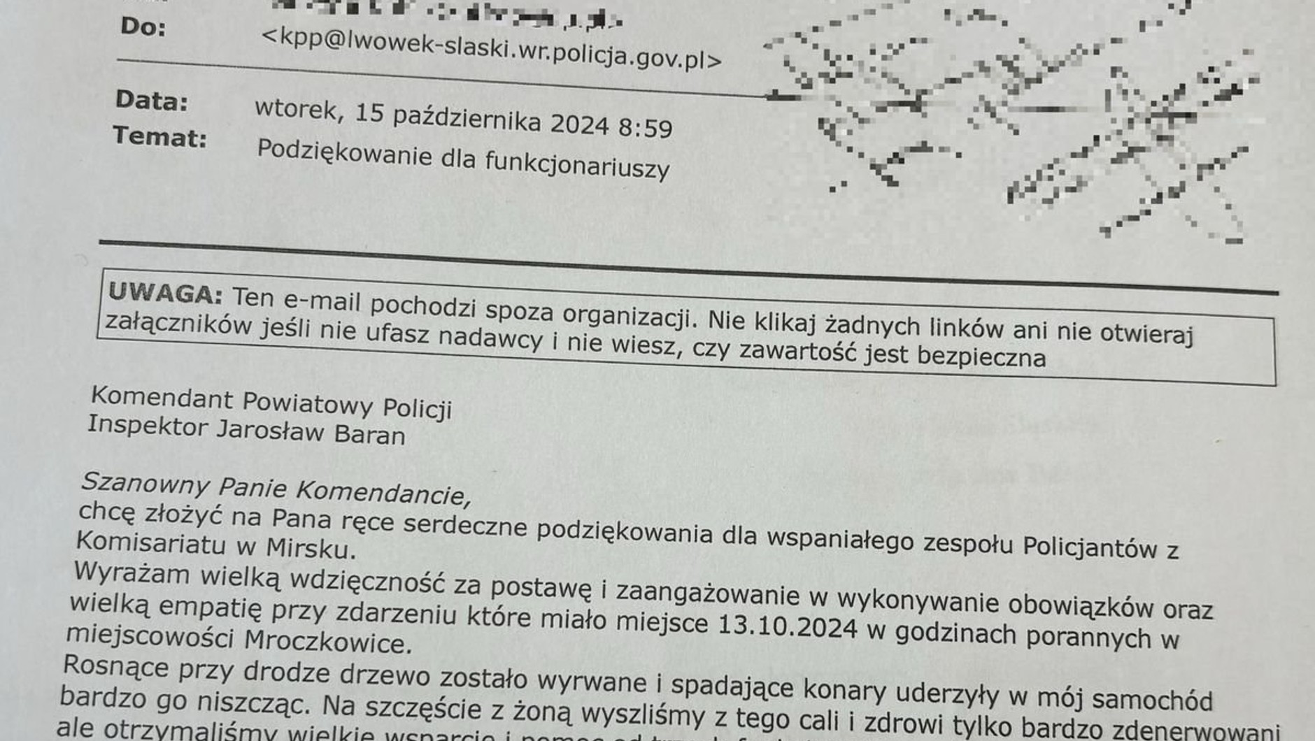 We wtorek do Komendanta Powiatowego Policji w Lwówku Śląskim wpłynęły podziękowania od małżeństwa. Wyrazili oni głęboką wdzięczność za zaangażowanie i profesjonalizm funkcjonariuszy. Podkreślili, że ich interwencja była nieoceniona w stresujących warunkach pogodowych.