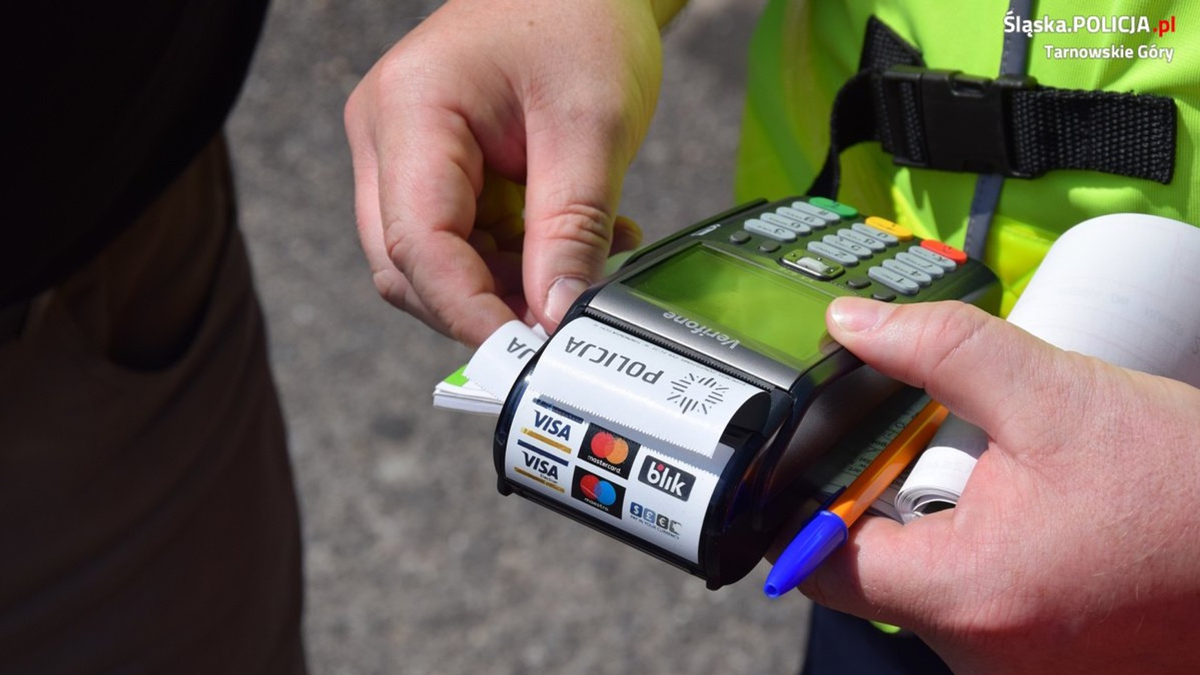 Policjanci posiadają w radiowozie terminal płatniczy, za pomocą którego można uiścić grzywnę nałożoną w postaci mandatu karnego. Grzywnę można uiścić, używając tylko swojej karty. Płatność z tytułu nałożonej grzywny nie może być dzielona, tzn. niedopuszczalne jest przyjęcie należności za jeden mandat w dwóch transakcjach, jak również łączenie płatności gotówką z formą bezgotówkową. Jeżeli osoba wyrazi taką wolę, policjant zawsze wyda potwierdzenie dokonania płatności.