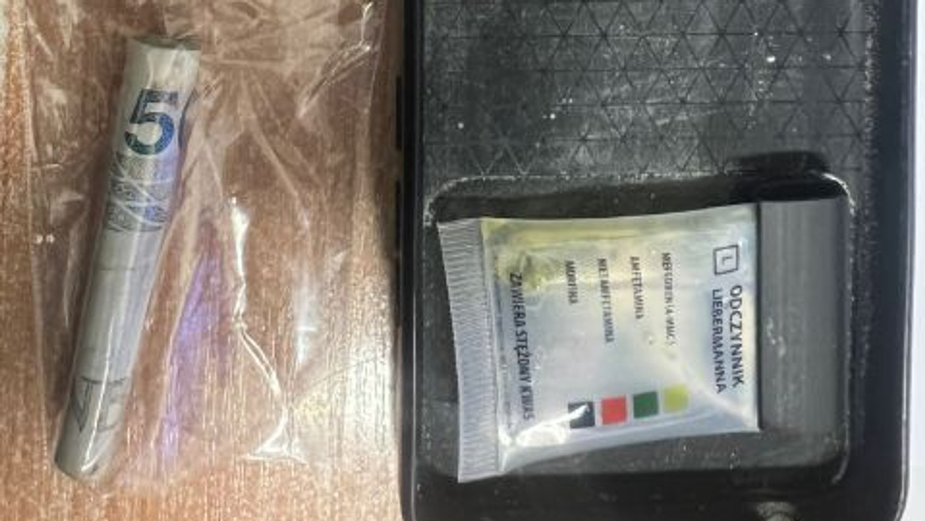 W trakcie kontroli pojazdu na siedzeniu pasażera policjanci zauważyli sylikonowe etui na telefon komórkowy pokryte fragmentami białego proszku, a tuż obok niej leżał zwinięty w rulon banknot. Mężczyzna przyznał się, że są to pozostałości po narkotykach, które brał kilka godzin wcześniej. Podczas przeszukania pojazdu funkcjonariusze znaleźli kolejne substancje zakazane, które przebadano testerem. Wynik przeprowadzonego badania wykazał, że w obu przypadkach był to mefedron. Mężczyzna został zatrzymany i pobrano mu krew do dalszych badań.