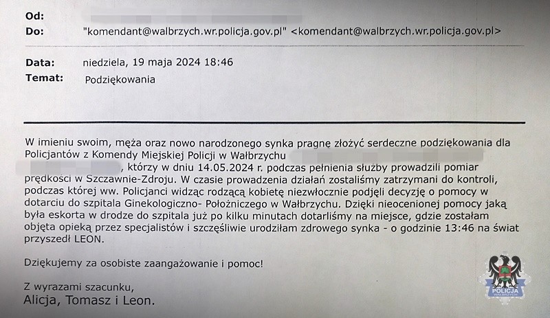 W niedzielę wieczorem, kilka dni po narodzinach syna, rodzice przesłali wzruszające podziękowania do komendy. W liście wyrazili wdzięczność dla policjantów, którzy nie zawahali się ani chwili, by pomóc. Oficer prasowy Komendy Miejskiej Policji w Wałbrzychu, kom. Marcin Świeży przekazał, że funkcjonariusze dziękują za słowa uznania i życzą rodzinie wszystkiego najlepszego, a przede wszystkim zdrowia dla małego Leona.