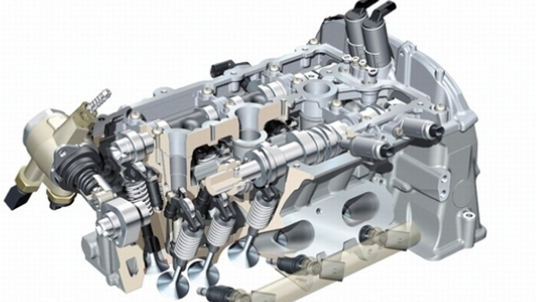 Każdy element krzywkowy posiada dwa umieszczone obok siebie profile dla małych i dużych wzniosów zaworów. Po przesunięciu w prawo, element krzywkowy znajduje się w pozycji pełnej mocy, wtedy większe krzywki pełnej mocy (oznaczone czerwono na zdjęciu) naciskają na bardzo wąskie dźwigienki rolkowe. Otwierają one oba zawory wlotowe na odległość 11,0 mm - idealnie dla dużych wielkości napełnienia i prędkości przepływu. Podczas obciążenia częściowego element krzywkowy jest przesuwany w lewo przez lewy trzpień - teraz aktywne są małe krzywki (zielone). Otwierają onezawory z małym i różnym skokiem, który wynosi tylko 2,0 względnie 5,7 milimetra. To asymetryczne otwarcie prowadzi do tego, że zasysane powietrze wpływa do cylindra z jednoczesnym zawirowaniem spiralnym i walcowym. Tak wytworzony ruch wirowy, który jest wspomagany przez krawędzie i wypukłości w komorze spalania oraz przez specjalny kształt tłoka, czyni zbędnymi klapy zawirowania ładunku w kanale ssącym, które normalnie są potrzebne w silnikach FSI. Przełączanie między wzniosami zaworów odbywa się w zakresie obrotów od 700 do 4000 1/min, przebiega ono w czasie zaledwie dwóch obrotów wału korbowego.