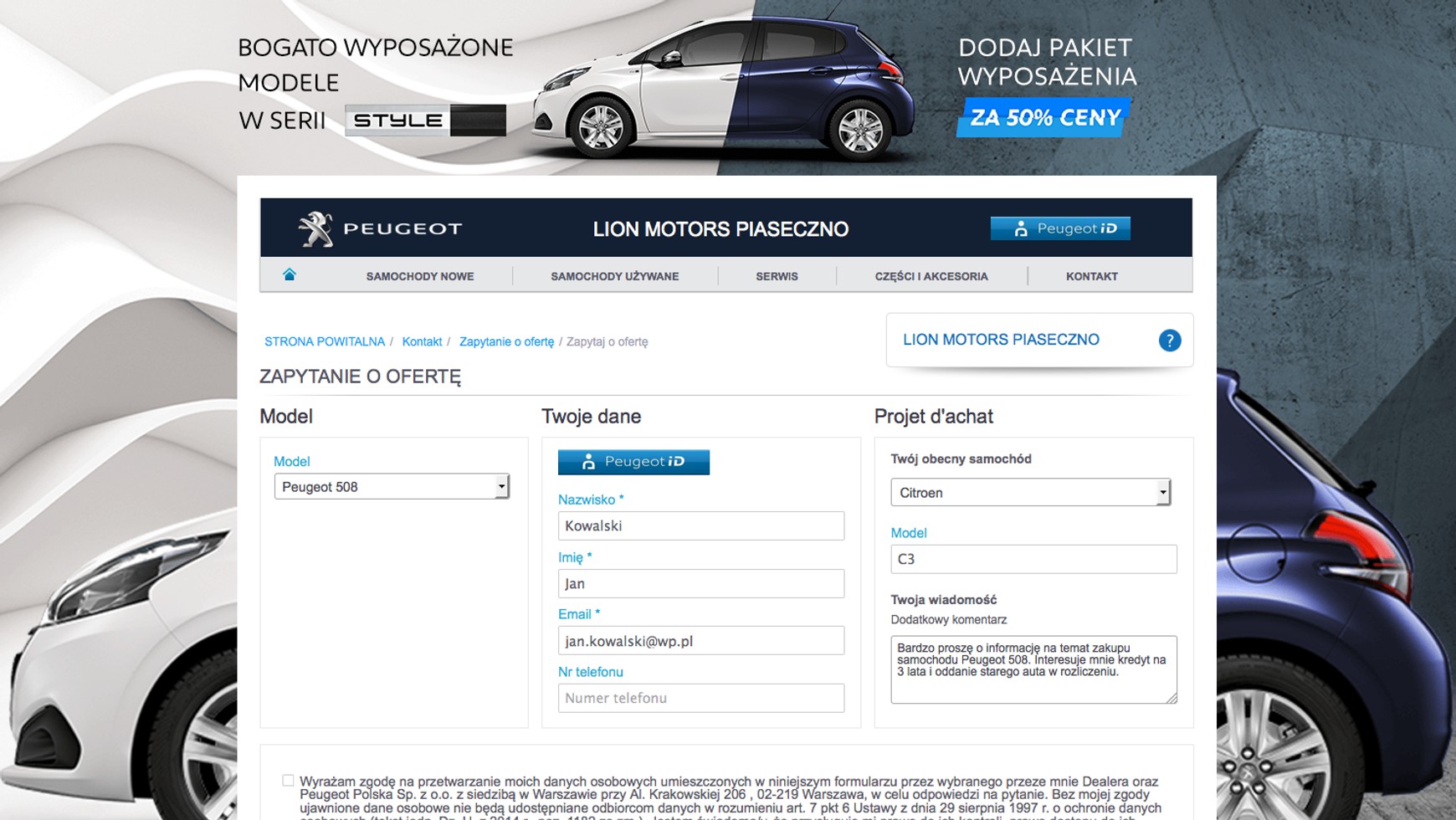 Możemy także, wprost ze strony WWW salonu, wysłać mejla z zapytaniem o szczegóły techniczne czy sposób sfinansowania zakupu nowego auta.
