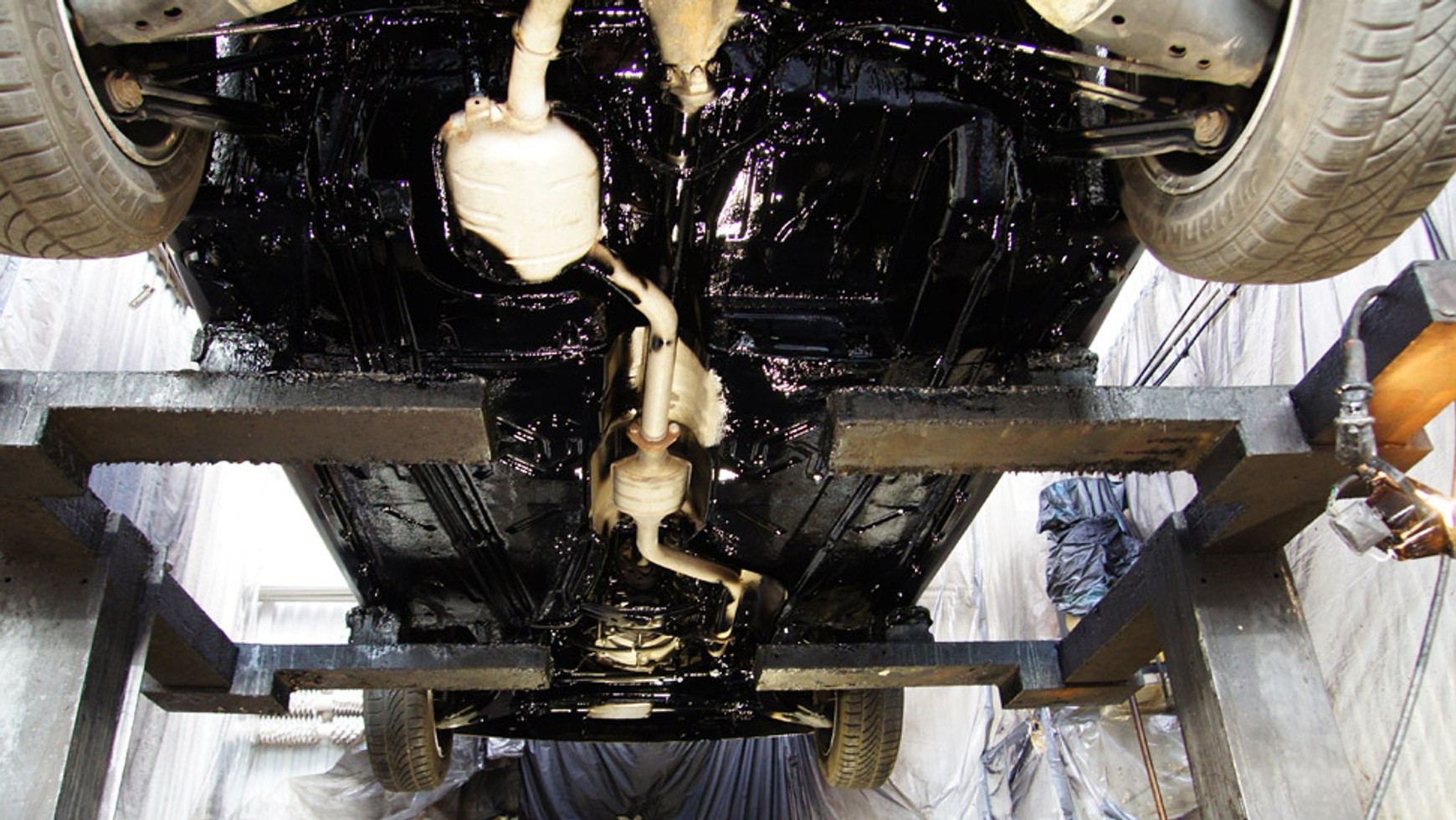 Wykonanie skutecznego zabezpieczenia płyty podwozia w warunkach garażowych jest niemal niemożliwie. W warsztacie gęsta masa zabezpieczająca podłogę nanoszona jest pod ciśnieniem 200-300 barów, dzięki czemu doskonale wypełnia wszelkie szczeliny. Przed zastosowaniem tego typu preparatów blacha musi zostać oczyszczona z ognisk korozji. Rdza usuwana jest najpierw mechanicznie, a następnie chemicznie, np. przy użyciu środków na bazie kwasu fosforowego. Czystą blachę należy zabezpieczyć podkładem antykorozyjnym – dopiero później można na nią nanieść warstwę preparatu bitumicznego. Trwałość powłoki to mniej więcej 4 lata.