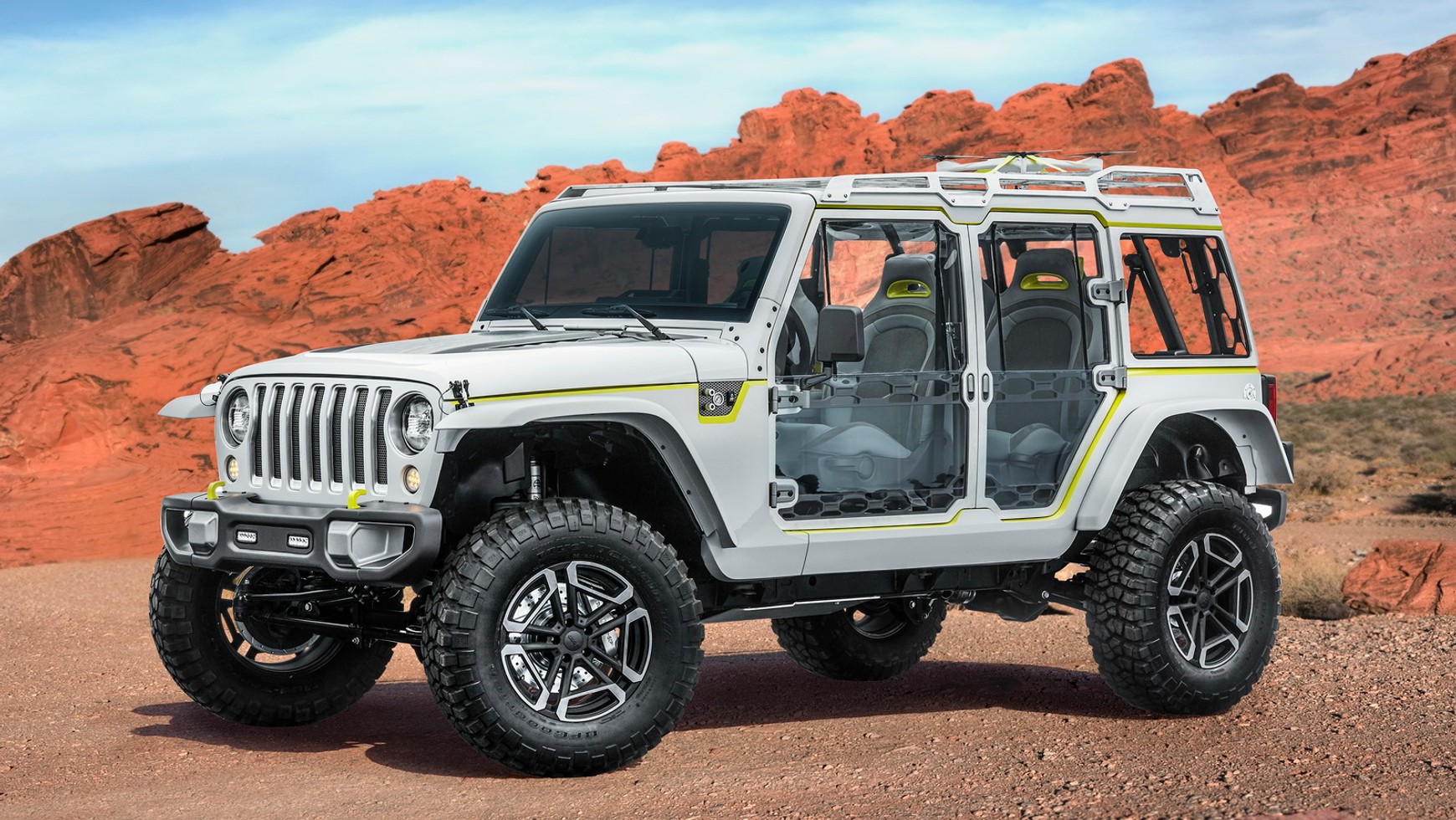 Prócz półprzezroczystego hard-topu Wrangler Unlimited ma w pełni transparentne drzwi utrzymujące się na aluminiowym stelażu, otwierane w niestandardowy sposób. Aby było to możliwe zmieniono słupek B oraz przeniesiono zawiasy na część nadwozia nad tylnym kołem. Ponadto na dachu zamontowany został „kosz”, na którym można przewozić np. drona. Wewnątrz ze standardowego wyposażenia została jedynie deska rozdzielcza oraz pałąk przeciwkapotażowy. Naszą uwagę przykuły 4 kubełkowe fotele, kolorystycznie nawiązujące do karoserii. Czyżby klienci przestali nabierać się na „trzyosobową” kanapę z tyłu?